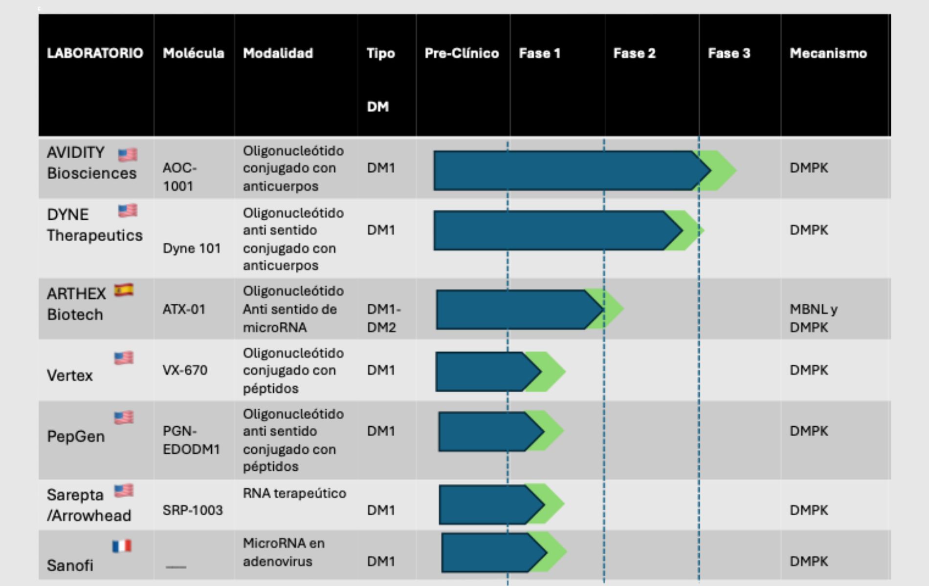 En los últimos 4-5 años, un número relevante de Laboratorios han iniciado ensayos clínicos para testar compuestos con distintos mecanismos de acción en el gen DMPK (causante de DM1).